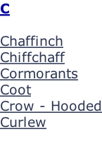 H  Harrier - Hen Heron - Grey C  Chaffinch Chiffchaff Cormorants Coot Crow - Hooded Curlew G  Geese Grebe  Greenfinch Goldfinch Gull - Glaucous  Guillimot All birds are in family groups in alphabetical order, please click on your chosen image to view D  Dipper Divers Dunnock Dunlin Ducks B  Blackcap Bullfinch Bishop - Black Winged Blackbird Bunting - Reed Buzzard F  Fieldfare Flycatcher Fulmar J  Jay K  Kingfisher Kestrel Kite Kittiwake M  Magpie Merlin N  Nuthatch P  Partridge - Red Legged Peregrine Falcon Pipits Plover - Golden E  Egret - Little Eider L  Lapwing Linnet A  Avocet O  Oyster Catcher Owl - Barn Owl - Short Eared R  Rail - Water Raven RazorBill Redpoll Redwing Robin Redshank Red Brested Merganser S  Sanderling Sand Martin Sandpiper - Wood Sandpiper Purple Scaup Shag Shelduck Shoveler Siskin Skua - Great Skylark Snipe Sparrow Sparrowhawk Stonechat Swan  Swallow T  Turnstone Tern Tit Family Thrush Treecreeper Twite W  Wagtail Warbler  Waxwing Widgeon Woodpecker  Woodlark Wheatear Whimbrel Whitethroat Wren Y  Yellowhammer I